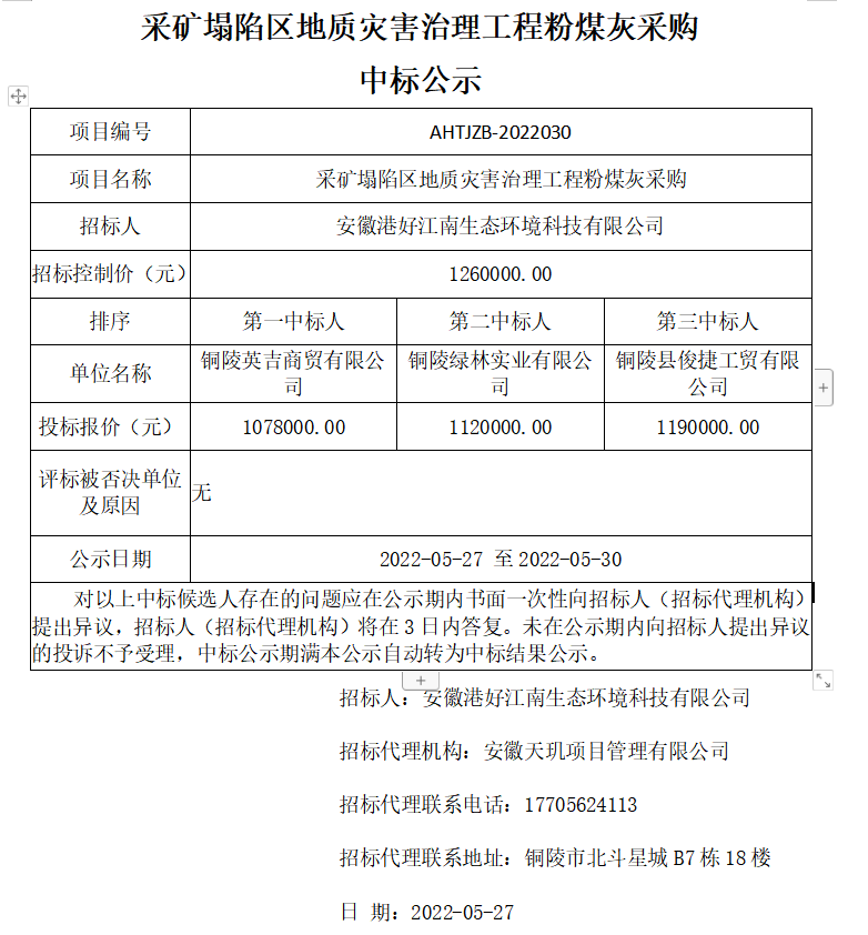 采矿塌陷区地质灾害治理工程粉煤灰采购中标公示